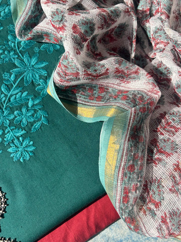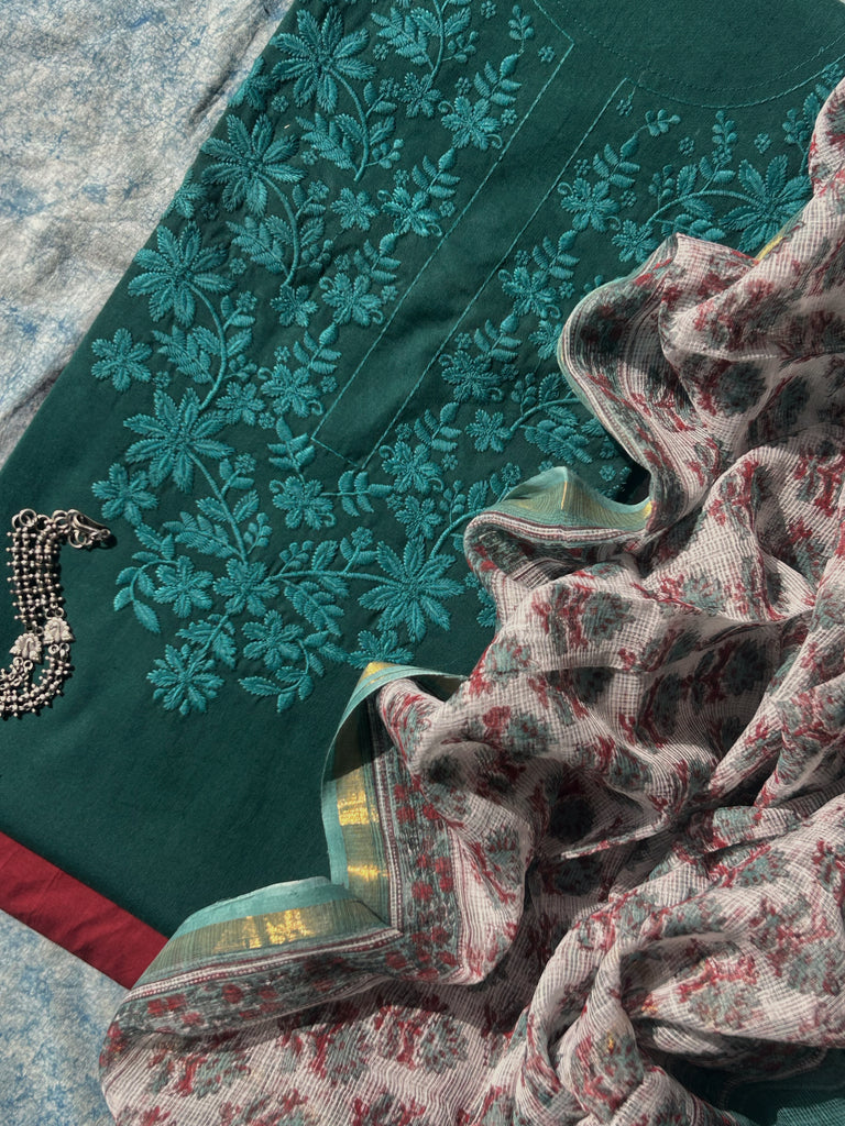 - 2.5m kurta fabric in cotton flex, with elaborate hand machine embroidered neck detailing