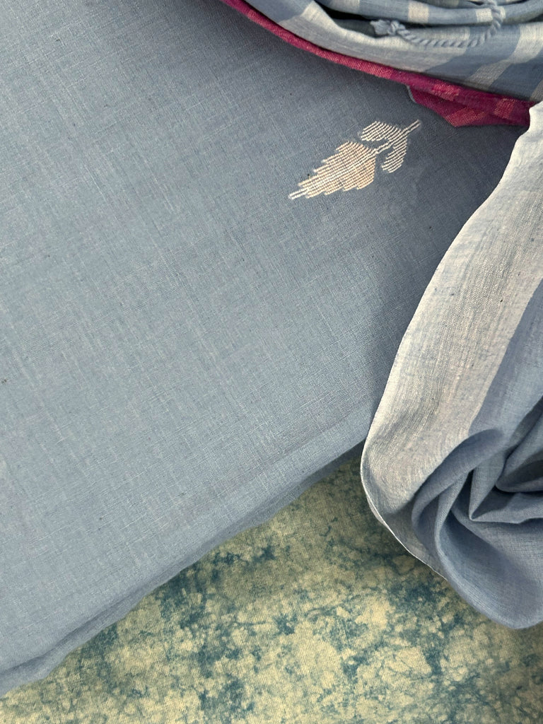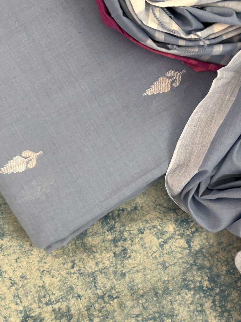 Woven on traditional looms by skilled Bengal artisans, this Jamdani butti cotton set is a celebration of timeless craftsmanship. The fabric is lightweight, airy, and naturally breathable, offering all-day comfort without compromising on elegance.