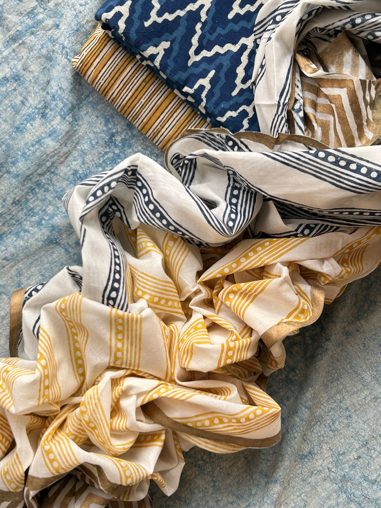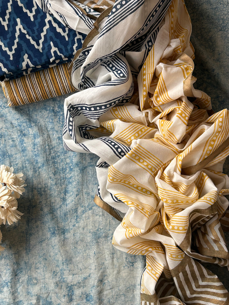 Our exclusive edit of hand block printed cotton suits made crafted using azo free dyes. The breezy cotton printed dupattas add a hint of oomph to your everyday style story. These Humble and comfortable fabrics crafted using Azo free dyes are our pick for the hot days ahead.