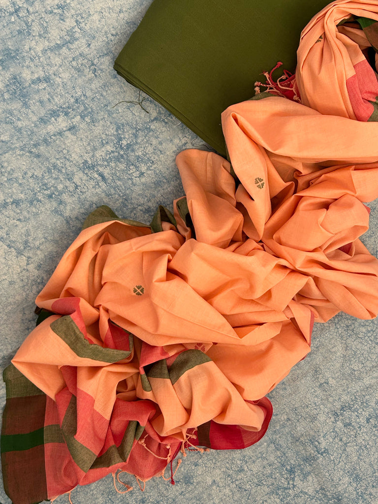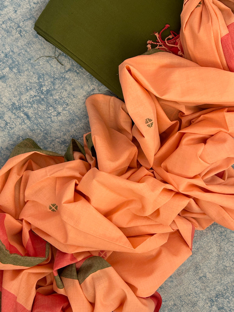 - Dupatta: 2.4 m and above 84*84 tc cotton bengal jamdani weaving in peach hues