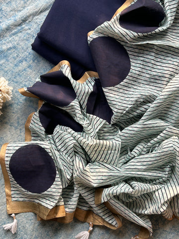 Express love for handcrafted for all seasons. The handwoven ikath weaving cottons kurta has been teamed with a handblock printed cotton dupatta with hand done tassels