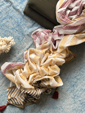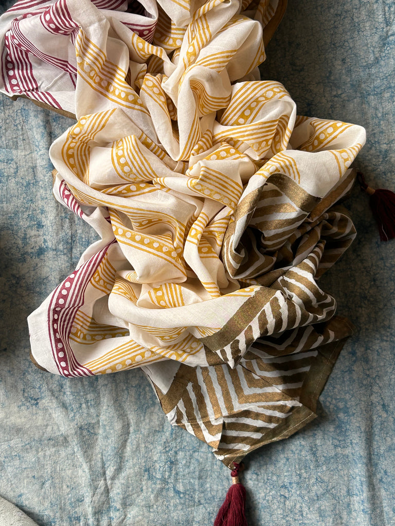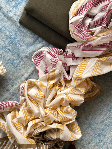 • Dupatta: 2.3 m and above cotton with handblock printing from bagru cluster and hand done tassels