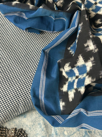- Kurta: 2.5m Handwoven checkered navy blue and ivory ikat cotton